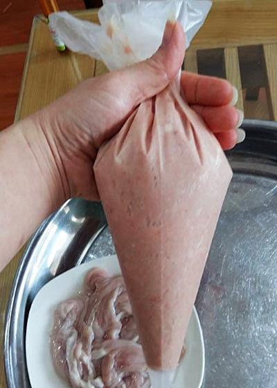 - Chuẩn bị 1 túi (như túi làm kem), đổ giò vào đó, rồi bóp cho vào lòng non.