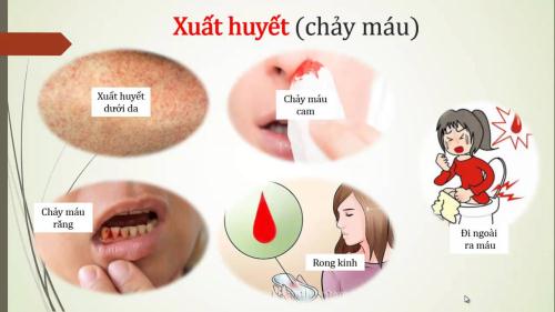 - Xuất huyết thường ở nhiều dạng - Xuất huyết dưới da: Trên da có những chấm nhỏ màu đỏ, đốm đỏ hay vết bầm. Phân biệt với vết muỗi cắn bằng cách căng da chung quanh chấm đỏ, nếu vẫn còn chứng tỏ là xuất huyết dưới da, ngược lại nếu biến mất thì đó là vết muỗi cắn.